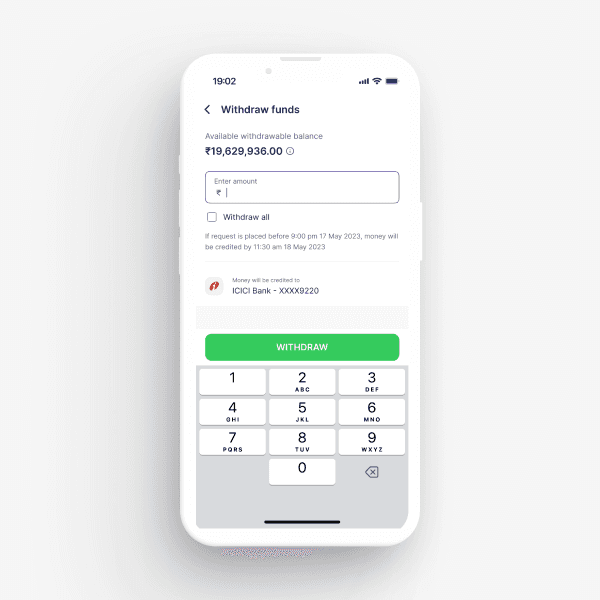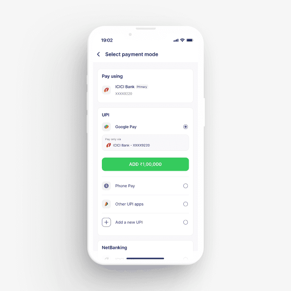 Unified pay-in/pay-out for both mutual funds and stock trades. Users could add money via UPI or net banking, see available cash vs. margin, and withdraw in 2 taps.