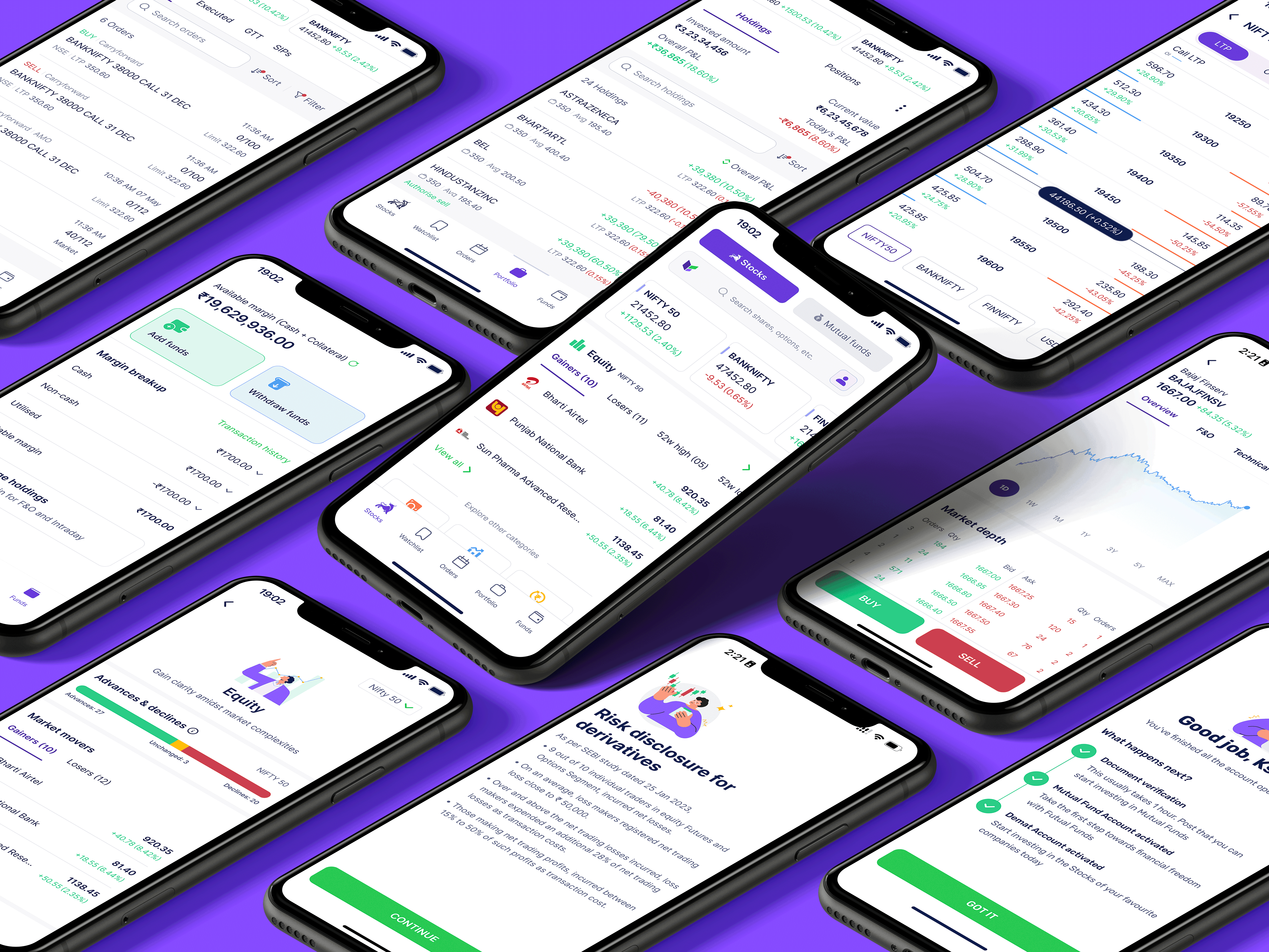 Built the full trading experience: order placement (Futures, Options, Equities), portfolio tracking, fund management, GTT orders, screeners, IPOs, and alerts. Designed for compliance-first UX - every flow passed SEBI review before launch.